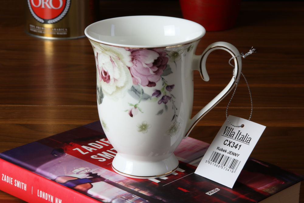 Przepiękny kubek JENNY wykonany jest z bardzo cienkiej i delikatnej porcelany kostnej w odcieniu mlecznej bieli. Niezwykle lekki, dekorowany motywem kwiatowym kubek będzie elegancką ozdobą stołu. Na każdej ze stron kubka umieszczono nieco inny motyw dekoracyjny. Klasyczny charakter kubka JENNY podkreślają ręcznie malowane złote linie na obrzeżu, stopce i uchwycie. W kolekcji dostępne również naczynia z innym motywem kwiatowym.