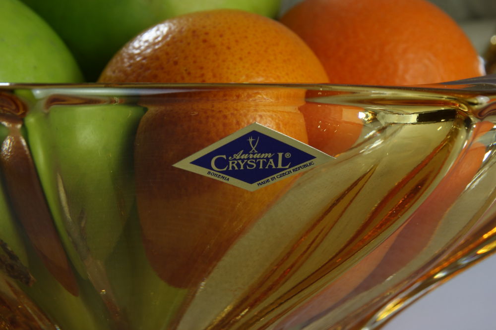 Efektowna kryształowa misa do podawania owoców, ciastek czy cukierków w w ciepłym kolorze bursztynu od znanego producenta szkła i kryształu – firmy Bohemia.