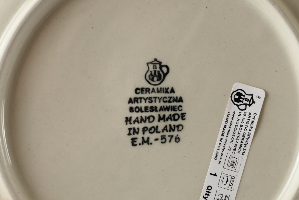 Dekoracja o symbolu 2068X to charakterystyczna kamionka z Bolesławca w kremowym kolorze. Zdobienie stanowią granatowe elementy roślinne