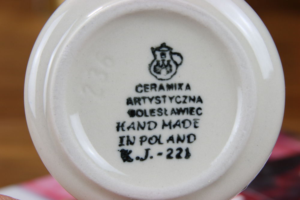 Dekoracja o symbolu 54X to charakterystyczna kamionka z Bolesławca w kremowym kolorze. Zdobienie stanowią granatowe tło z elementami zieleni oraz kółka z czerwonym środkiem.